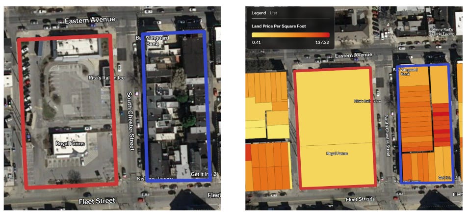 I compared the Royal Farms parcel, a small market located on a large lot, to a commercial building located catty-corner. Parking lot space accounts for 90% of the Royal Farms footprint, but only 50% of the building across the street, yet despite being a more efficient use of land, it pays nearly four times the property taxes per square foot.