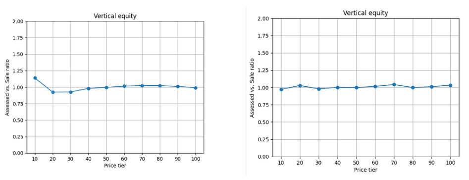 I will also note that our data reveals parcel-level overassessment (”low-priced homes are over assessed”) but not neighborhood-level overassessment (”low-income neighborhoods are over assessed”). At the parcel level, in Guilford County, our AVM overassesses the lowest decile of property values by around 1.2x. However, when aggregating to the neighborhood level, the lowest valued neighborhoods do not see overassessment. There is a lot of nuance to parse out here that may be saved for another article, but because these tests are done against sales prices, this suggests that some of the perception of the vertical equity issue may be driven by parcels that are sold for anomalously low prices at the lower values.