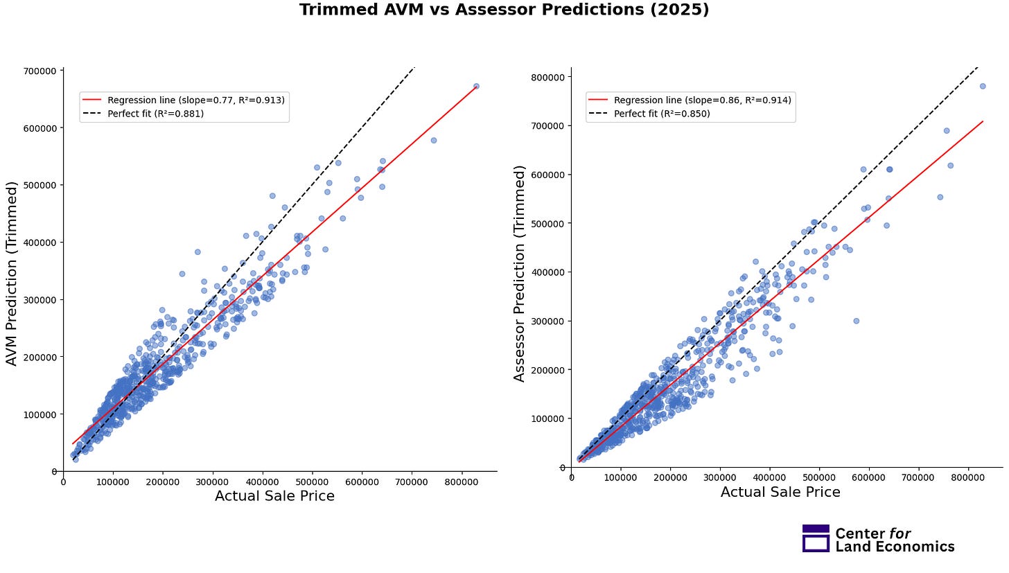 However, even with the lacking data, there is good news: enriching the data with public data sources can significantly help. So we did this with OpenAVMKit. After enriching the data with several public data sources, though still using the assessor’s shoddy building quality variable, our AVM performs impressively well when tested against sales data–competing with the assessors despite the poor data quality. Below are the charts that show the AVMs performance (left) against the assessor (right) on rowhome parcels. This exercise shows the promise of the combination of open-source data with open-source software, the capabilities of OpenAVMKit will only expand. The software was designed to be scalable across all jurisdictions.