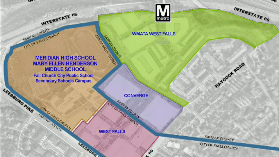 When the city rebuilt the local high school, they sectioned off a portion of the land (labeled “West Falls” in the image below) and transferred ownership to the newly created West Falls Community Development Authority (CDA). The CDA was empowered to issue bonds and enter into a lease agreement with a development partner, eventually choosing FCGP Development LLC.