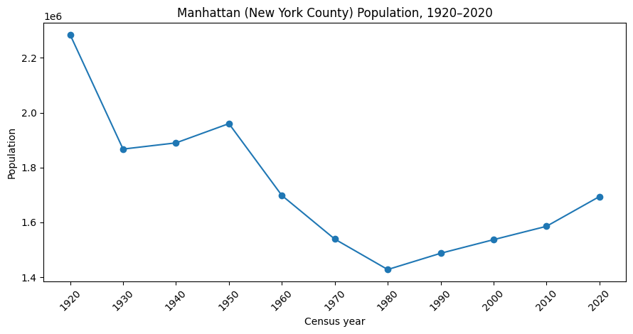 The result shows a dramatic decline in population-weighted density from the early 1900s through around 1980, followed by a long period of relative flatness, when the era of rapid outward expansion largely ended.1