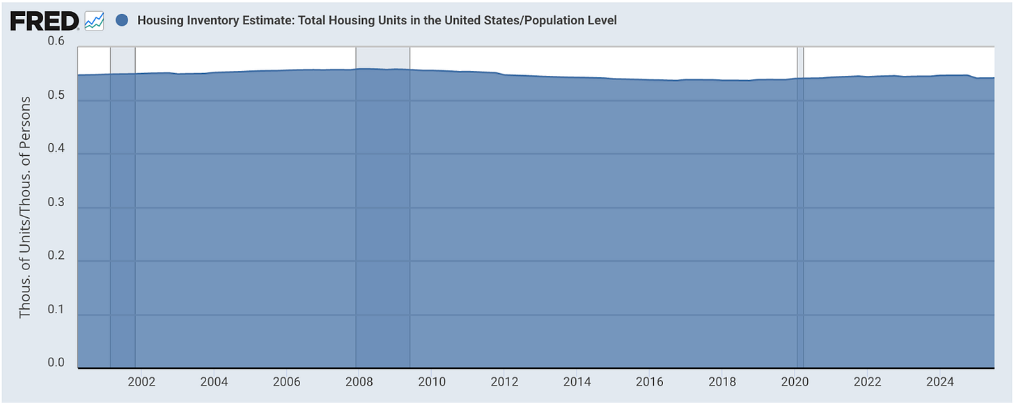 The United States did experience a decline in housing units per person following the Great Recession, when construction collapsed in the face of increasing population. However, that decline stabilized more than a decade ago. For roughly the past twenty years, per capita housing supply has remained relatively steady, fluctuating within a narrow range rather than trending downward.
