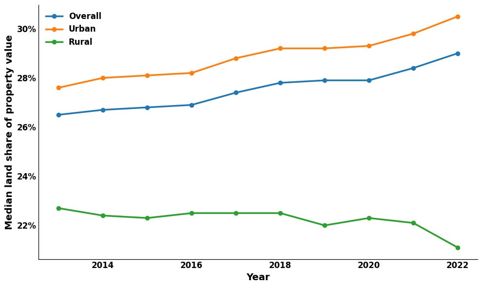 Researchers from the Federal Housing Finance Agency (FHFA) have constructed a database of land values at the local level using sales and construction data across the country. This gives us access to understand the time trends of land values, though at an admittedly zoomed-out level. Their data shows that over the past decade, the share of residential property value attributable to land has risen, particularly in urban areas. In rural areas, the land share has declined over the same period.