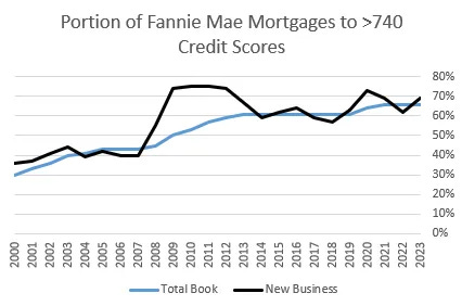Credit markets have also shifted. In the wake of the Great Recession, mortgage lending tightened substantially. A growing share of outstanding mortgages—and especially new originations—have gone to borrowers with very high credit scores, reflecting stricter underwriting standards, particularly after the 2008 financial crisis.