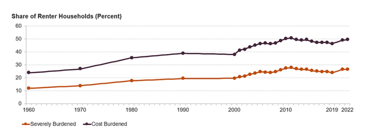 Here’s the evidence: a rising share of renters today are severely rent-burdened, paying over 50% of their income on housing. This share is trending near record highs not seen since the Great Recession, and has nearly doubled since 1970.