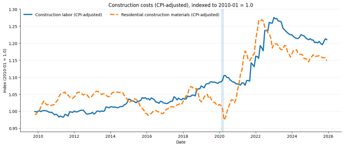 At the national level, the data do not support this story. Real residential construction input costs were largely flat throughout the 2010s, prior to the post-COVID supply-chain shock. While costs rose sharply after 2020, housing is a slow-moving asset, and these increases arrive too late to explain a crisis that has already been underway for decades. This series tracks inflation-adjusted producer prices for goods inputs to residential construction (materials and related goods) as well as construction labor costs.