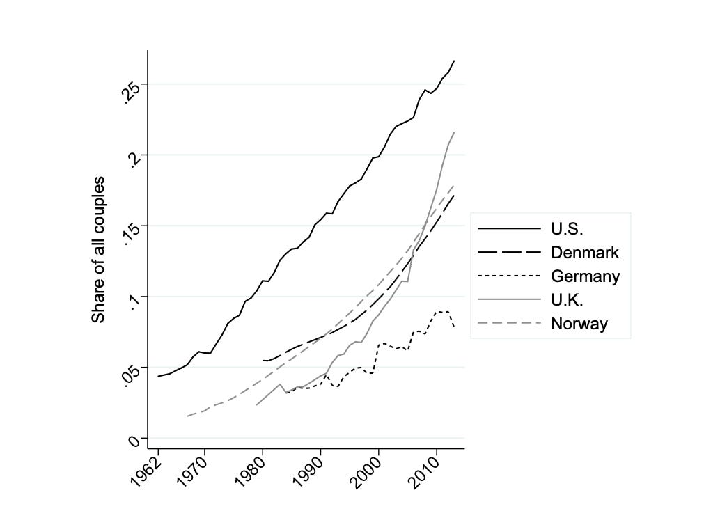 Labor market dynamics reinforce this pattern. Over time, college-educated workers have increasingly selected other college-educated workers for romantic partners. The proportion of couples in which both spouses have a college degree has increased from around 5% in the 1960s to around 25% now: