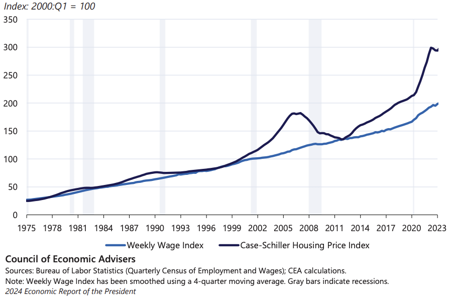A central feature of the housing affordability crisis is the growing gap between what households earn and what housing costs. One way to see this is by comparing wages to home prices over time. The figure below shows an index of weekly wages alongside the Case-Shiller Housing Price Index, which tracks changes in the prices of existing single-family homes. Since the early 2000s, home prices have risen faster than wages. This divergence means that buying a home requires an ever-larger share of household income, placing upward pressure on housing costs throughout the market.