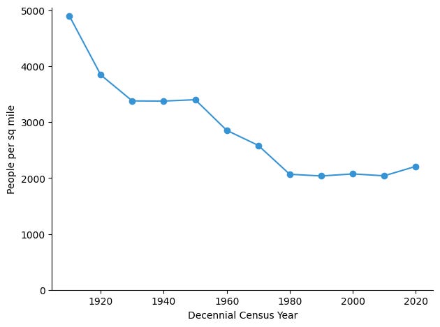 The result was a long period of de-densification. And, the broader trend is also visible when looking not at a single city, but at the average population density experienced by a U.S. resident over time. This is a graph of population-weighted density answers a simple question: how dense is the place where the average person lives?