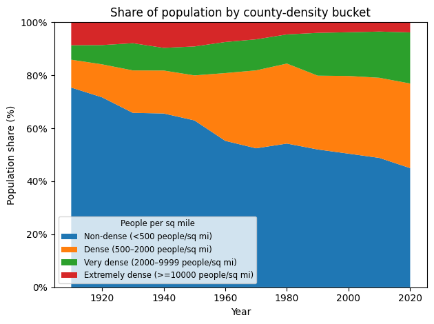 Unlike raw average county density, this graph weights counties by population, so that dense places where many people live matter more than sparsely populated areas. This series was constructed using decennial Census data at the county level, restricted to counties with consistent boundaries over time. County geography do not change frequently, but may have changed which impacts the analysis.