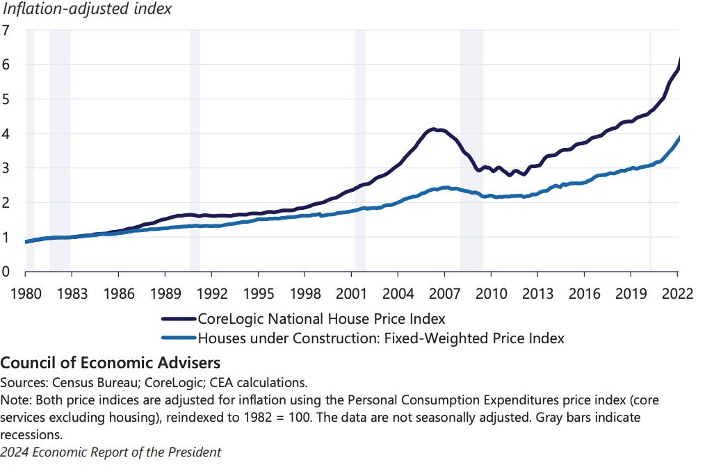 Taken together, these figures suggest that the housing crisis cannot be explained by a recent collapse in total physical housing supply, nor a sustained increase in costs of construction labor and materials.